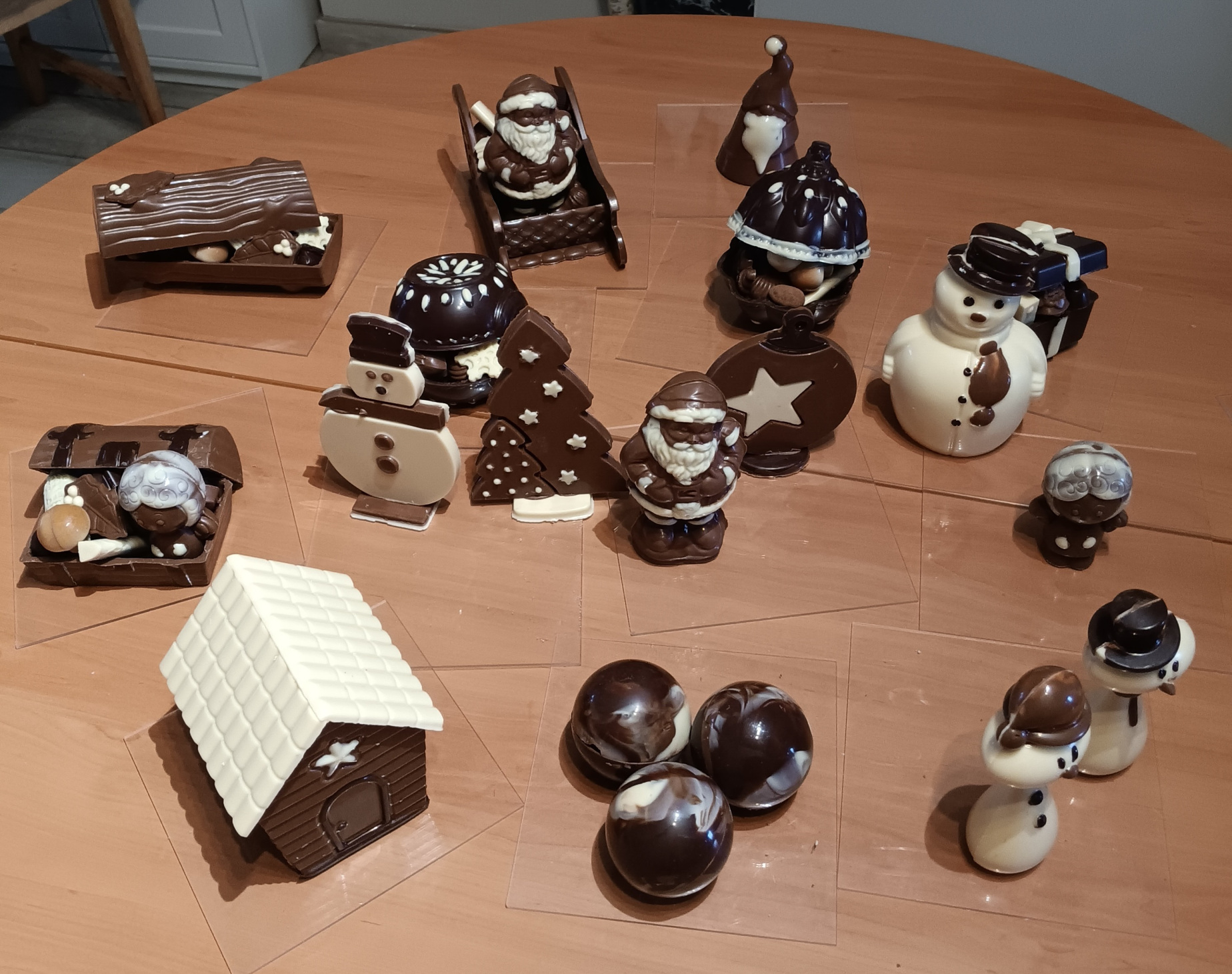 Boules en chocolat (les trois chocolat) emballées dans une boule en plastique afin de la pendre au sapin.