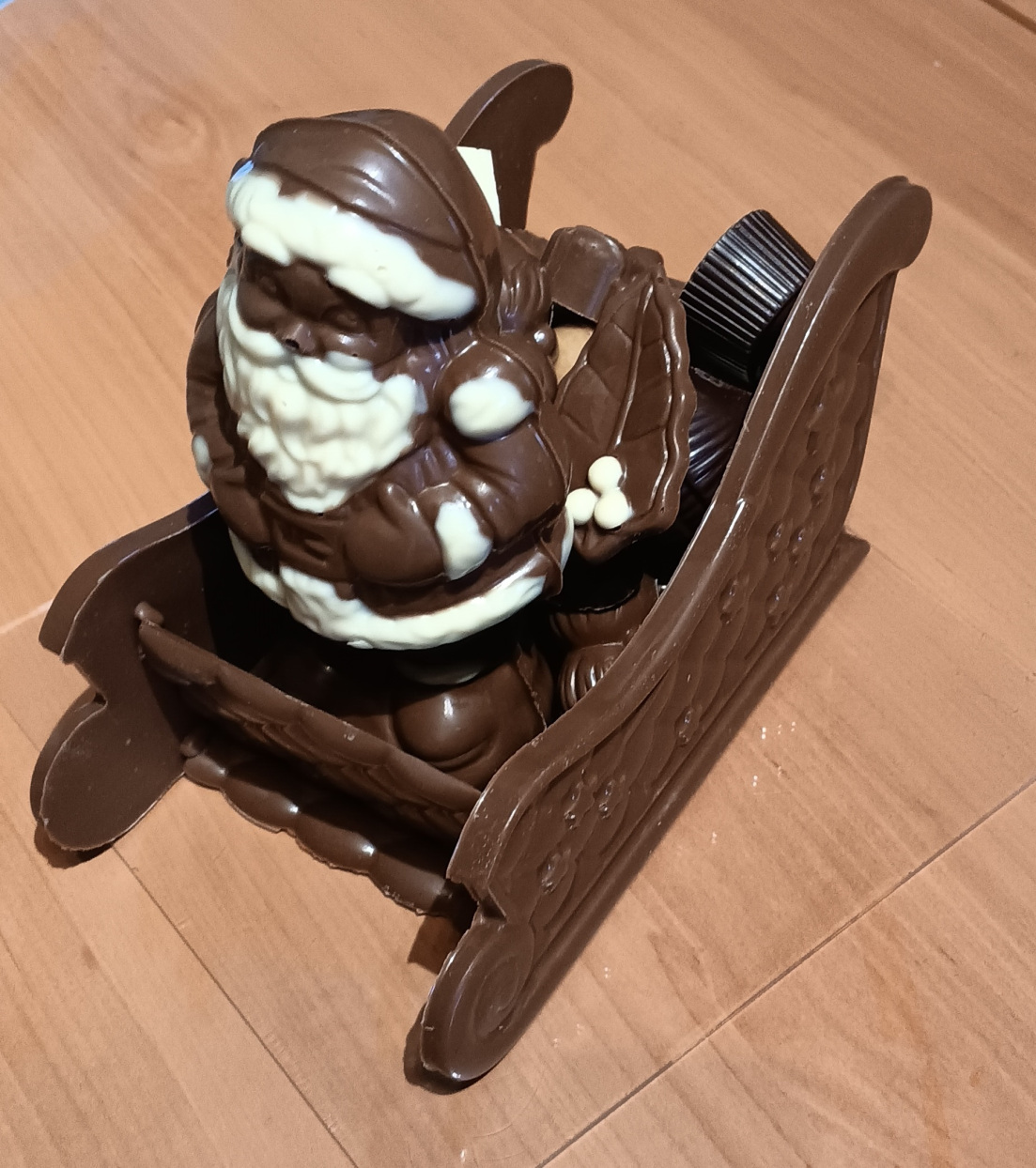 Traineau en chocolat noir ou lait, avec Père Noël noir, lait ou blanc avec ses pralines. Poid total 500g.