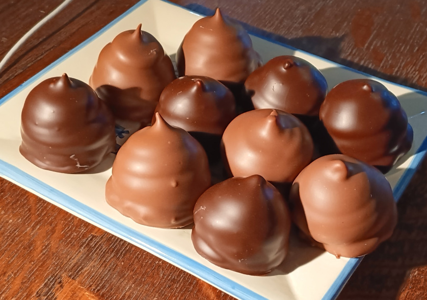 Amandes ou noix de cajou caramélisées enrobées de chocolat noir et poudre de cacao.