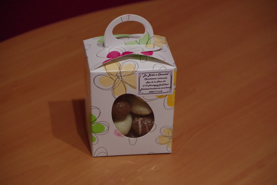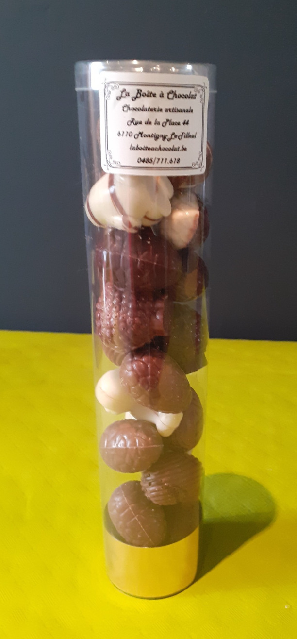 Boîte en chocolat noir, lait ou blanc garnie d'oeufs, petits animaux et caracs de tous les chocolats