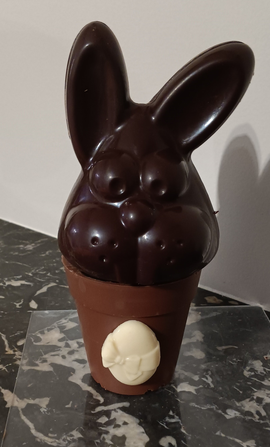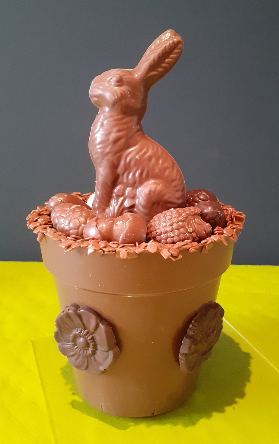 Petit pot en chocolat au choix avec un carac, rempli d'oeufs fourrés, de caracs et de pétoles de Monsieur Lapin (amandes/Noix de cajou caramélisées au chocolat), fermé avec une tête de lapin