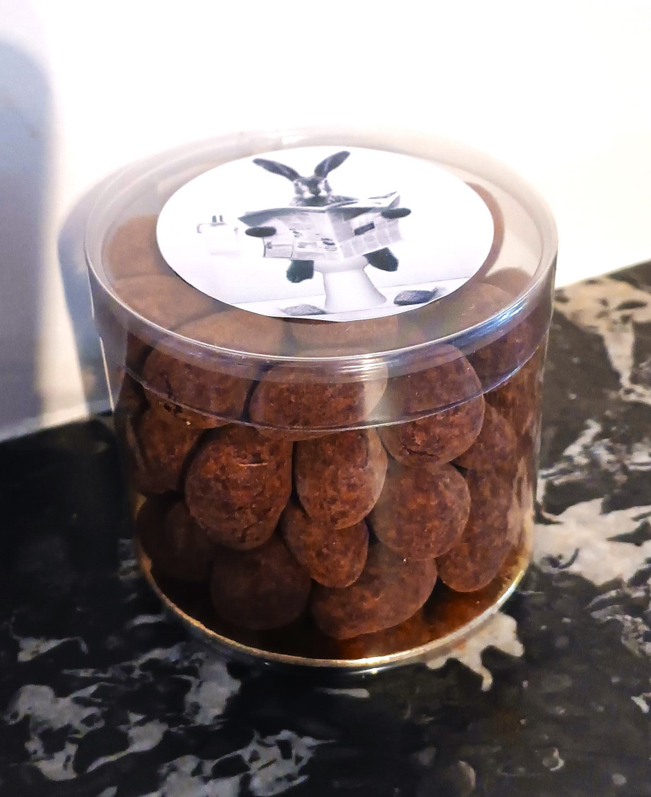 Amandes/Noix de cajou grillées et caramélisées entourées de chocolat et de poudre de cacao. Le prix est pour cet emballage de 140 g. Les pétoles peuvent être emballées dans d'autres conditionnements ou faire parties de mélanges avec les oeufs et les caracs dans les assemblages de votre choix