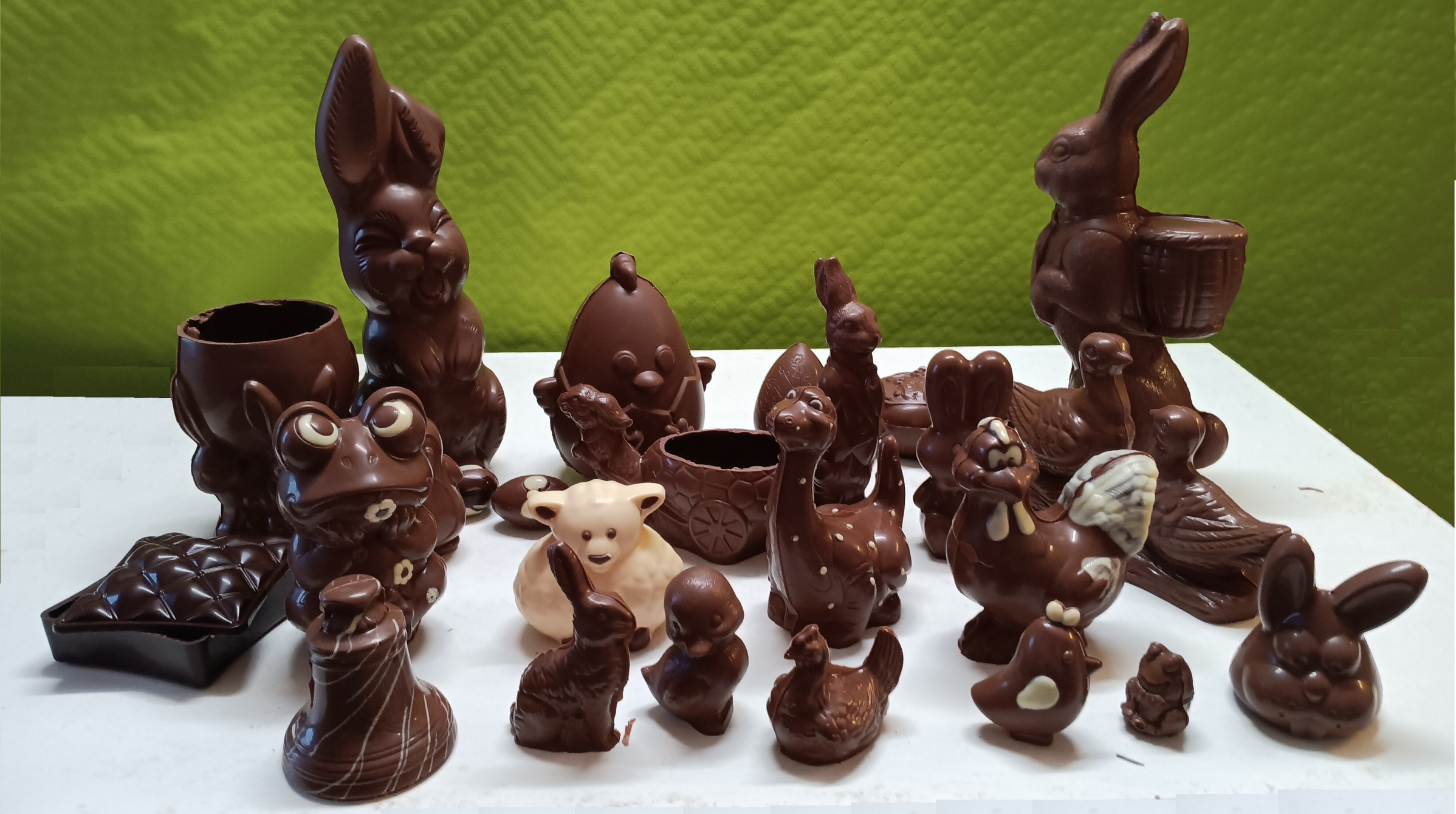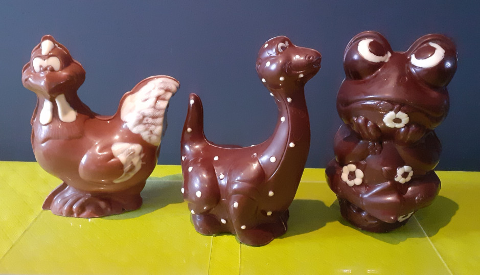 De gauche à droite 2.30 € le lapin, 1.90€ la poulette, 1€ la grenouille et 2.30 € la poule