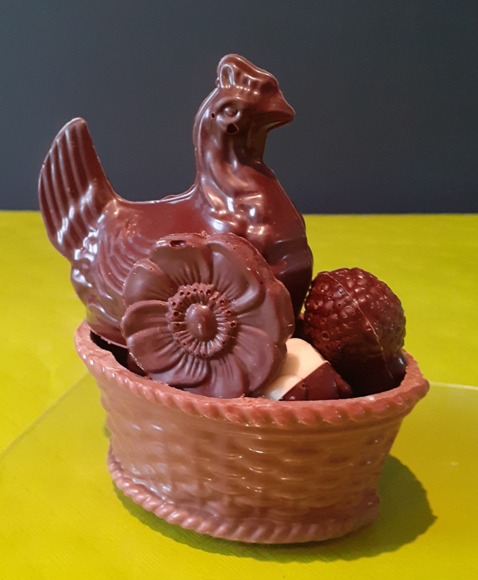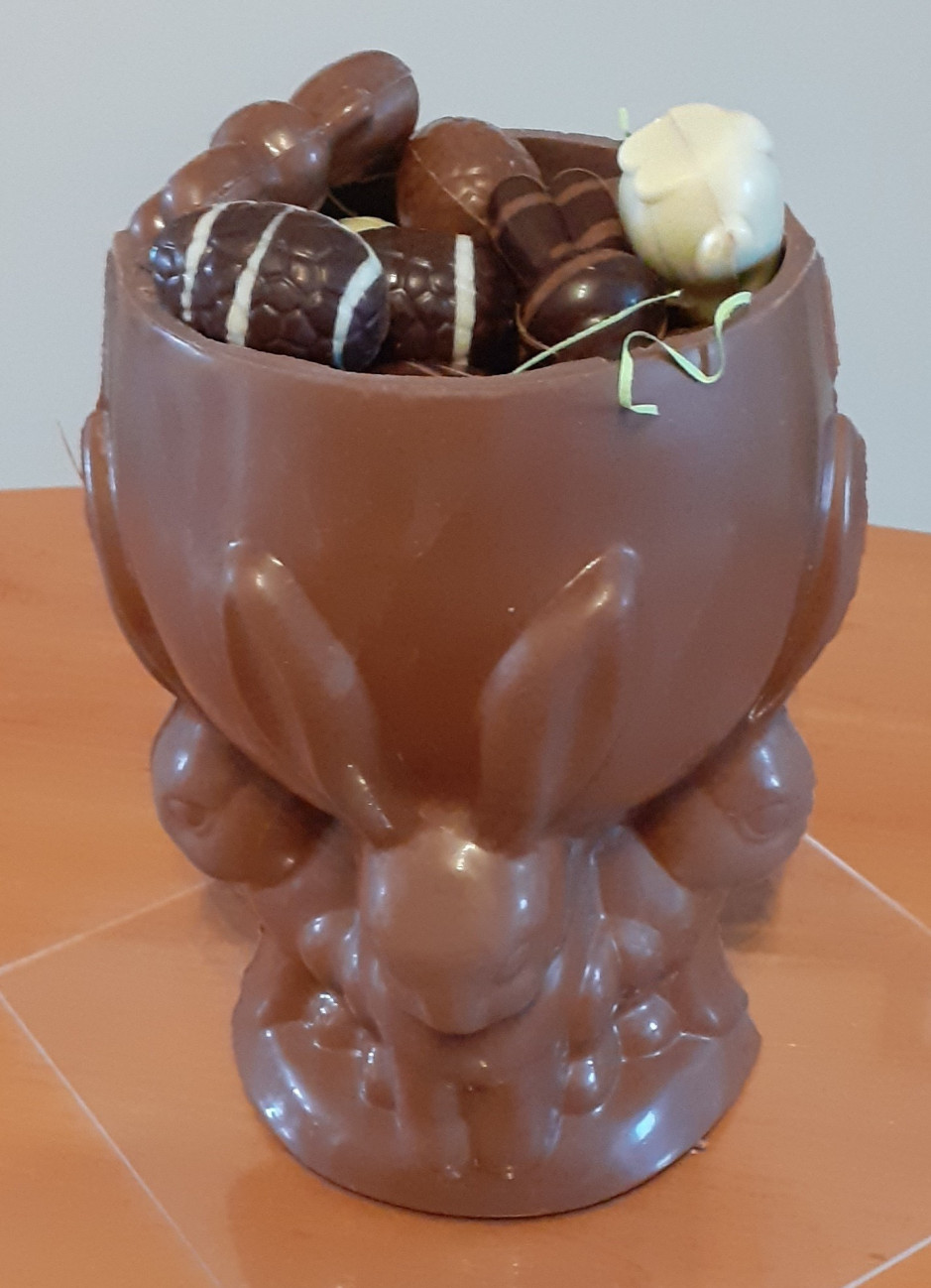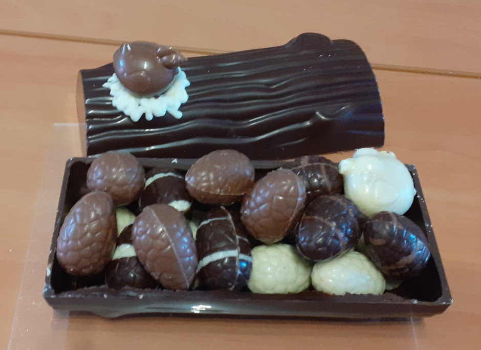 Petite auge en chocolat garnie de ses oeufs fourrés et caracs