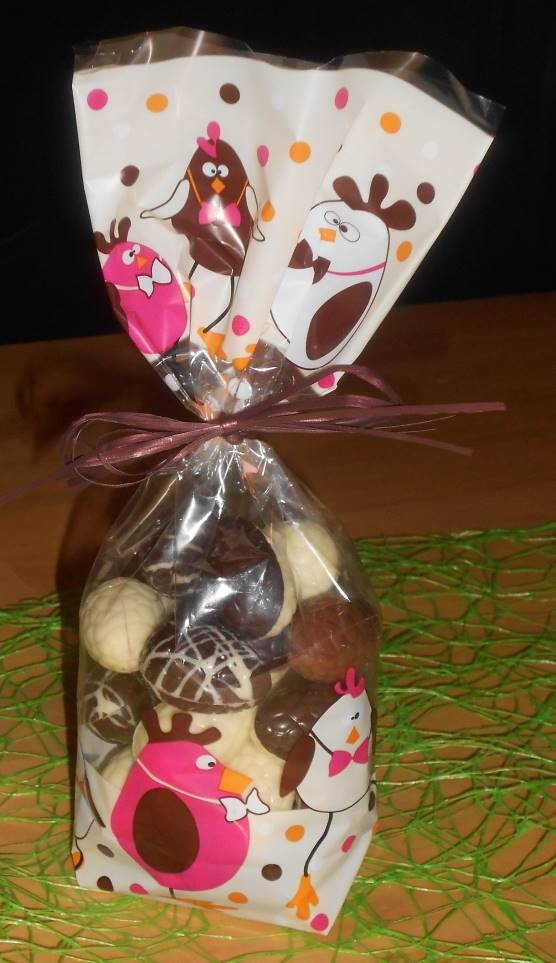 Sachet coloré de Pâques contenant 300 g de chocolat sous forme d'oeufs fourrés et de caracs
