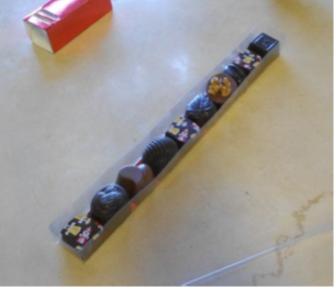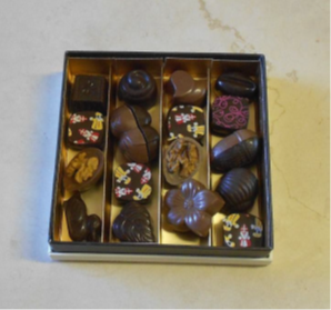 Boîte en chocolat de 15 sur 25 cm remplie de pralines (env. 650g de chocolat). Prix : 30€