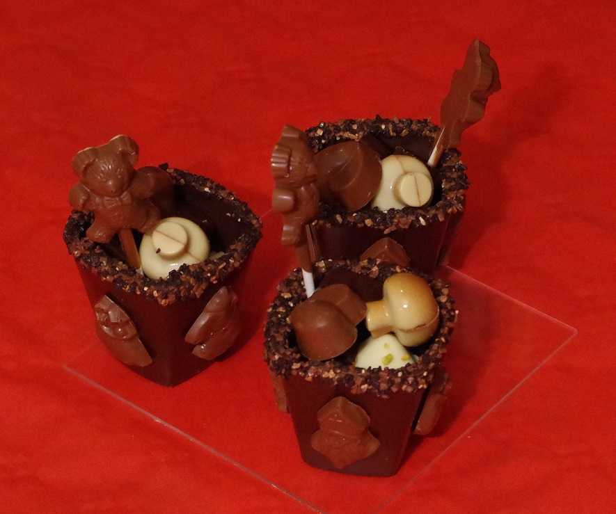 Gobelet en chocolat noir ou lait avec 100 g de pralines et une sucette en chocolat. Prix : 9,50€