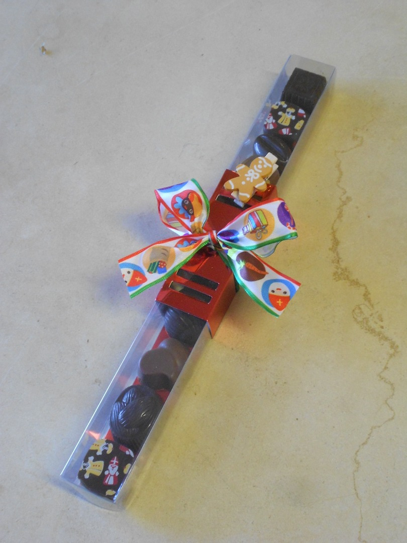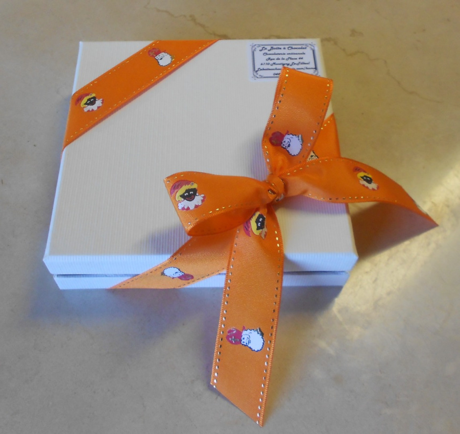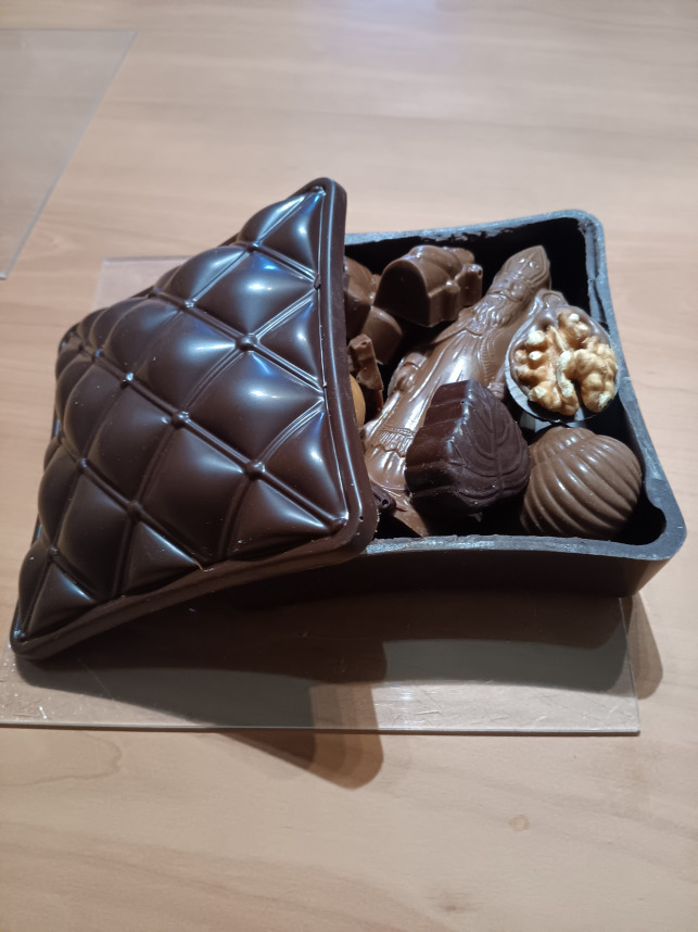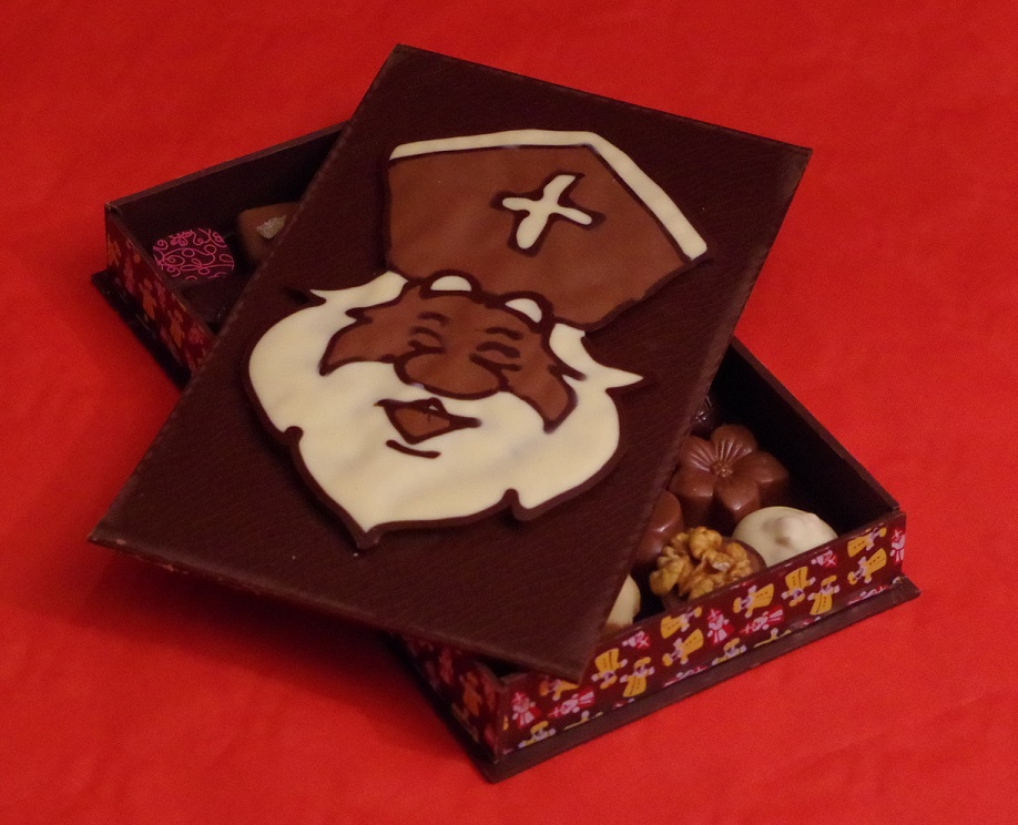 Boîte en chocolat, avec petit Saint-Nicolas et pralines. 450 g de chocolat. Prix : 20.70€