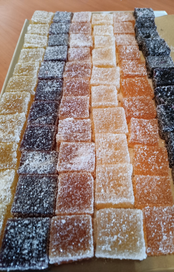 Nous avons commencé à produire des pâtes de fruit : pomme, poire, fruit de la passion, framboise, griotte et cassis ; d'autres sont au programme.
