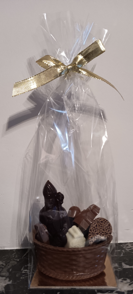 Panier en chocolat noir ou lait avec un petit Saint-Nicolas (couleur au choix) et des pralines et caraques. 230g de chocolat. Prix 10.60€