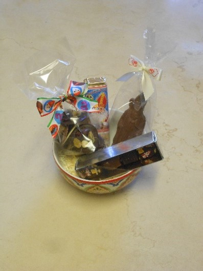 Petit Saint-Nicolas avec une sucette en chocolat et 100g de pralines. Prix : 8.30€