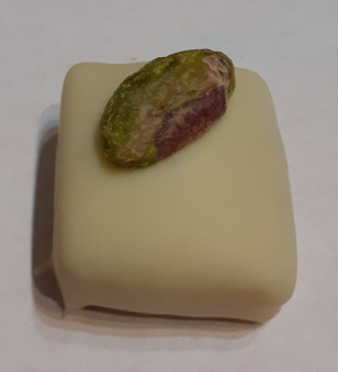 Ganache pistache, trempée dans du chocolat blanc.