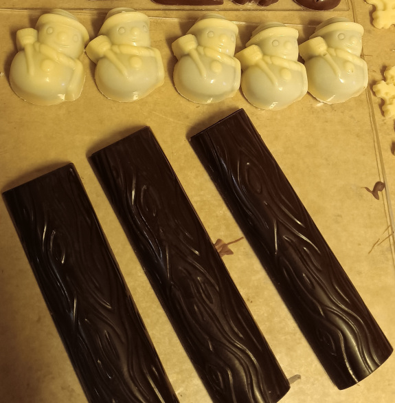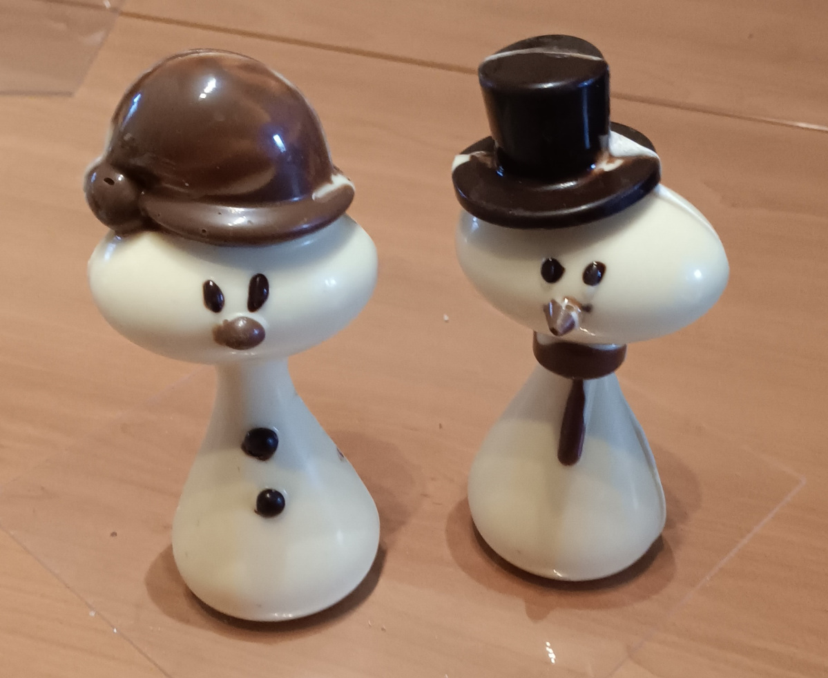 Petis bonshommes de neige en chocolat blanc tricolore. Poids 65g chacun