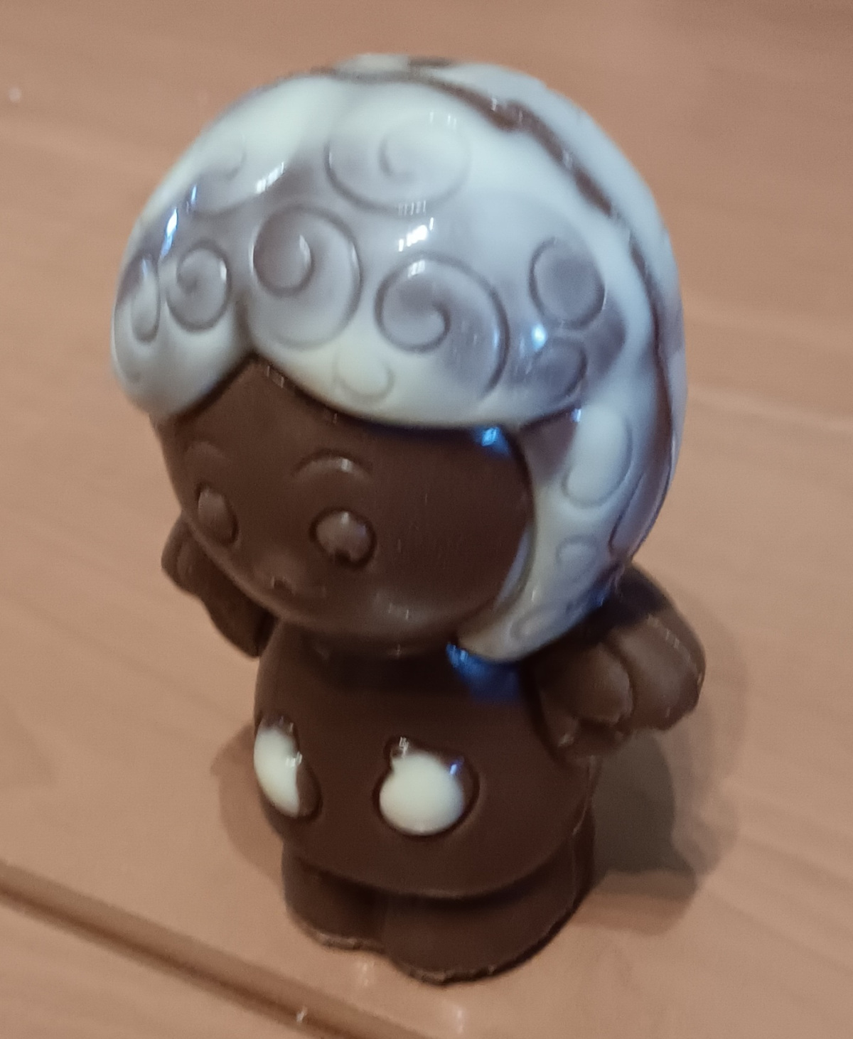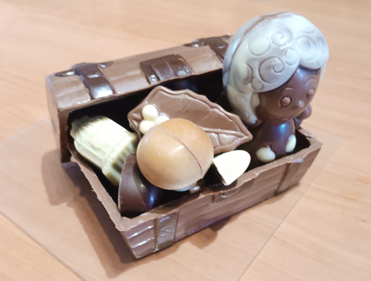 Coffre en chocolat noir ou lait, avec petit ange en chocolat et pralines. Poids : 300g
