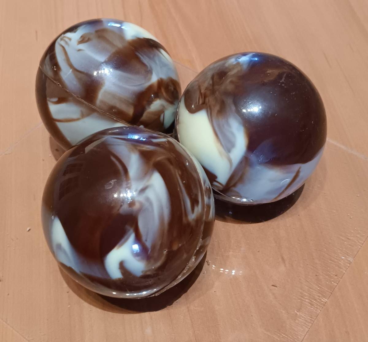 Boules en chocolat (les trois chocolat) emballées dans une boule en plastique afin de la pendre au sapin.