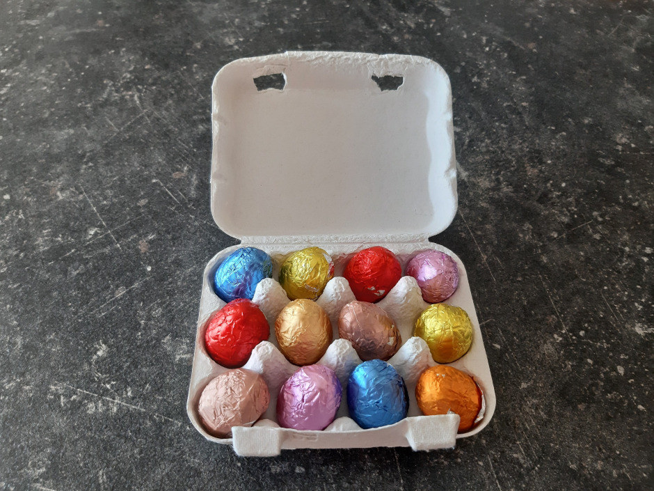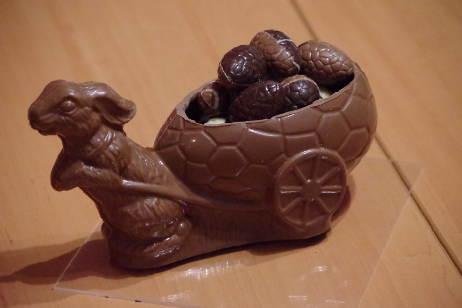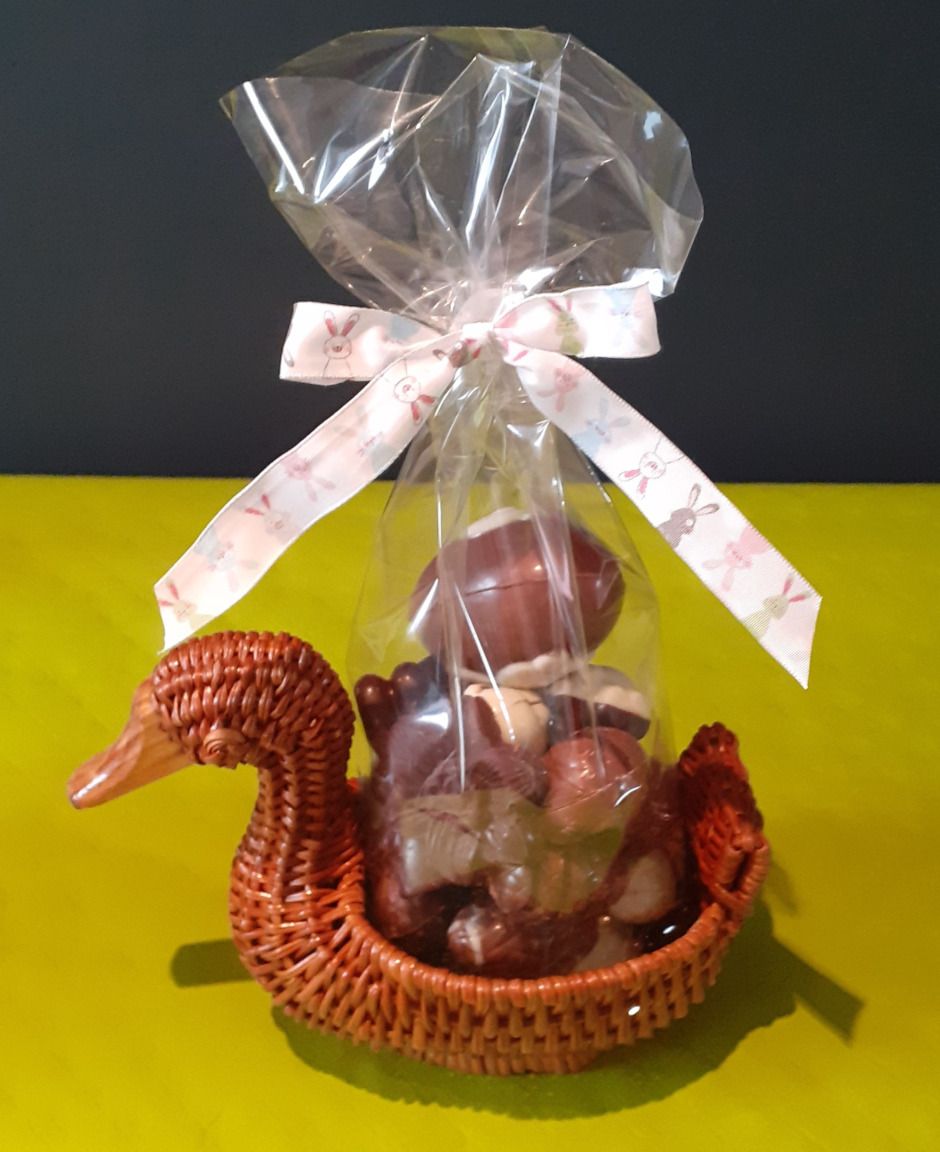 Petite auge en chocolat garnie de ses oeufs fourrés et caracs