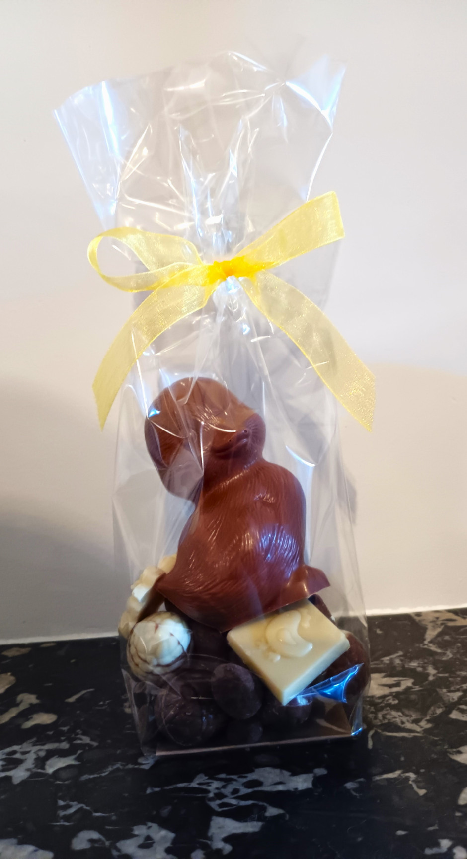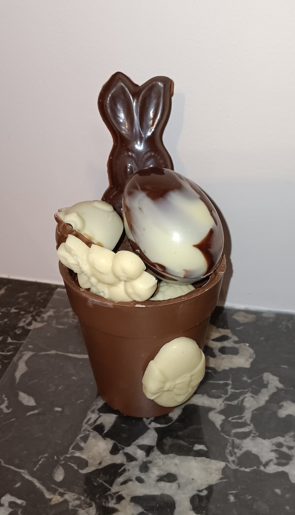 Petit pot en chocolat au choix avec un carac, rempli d'oeufs fourrés, de caracs et de pétoles de Monsieur Lapin (amandes/Noix de cajou caramélisées au chocolat), fermé avec une tête de lapin