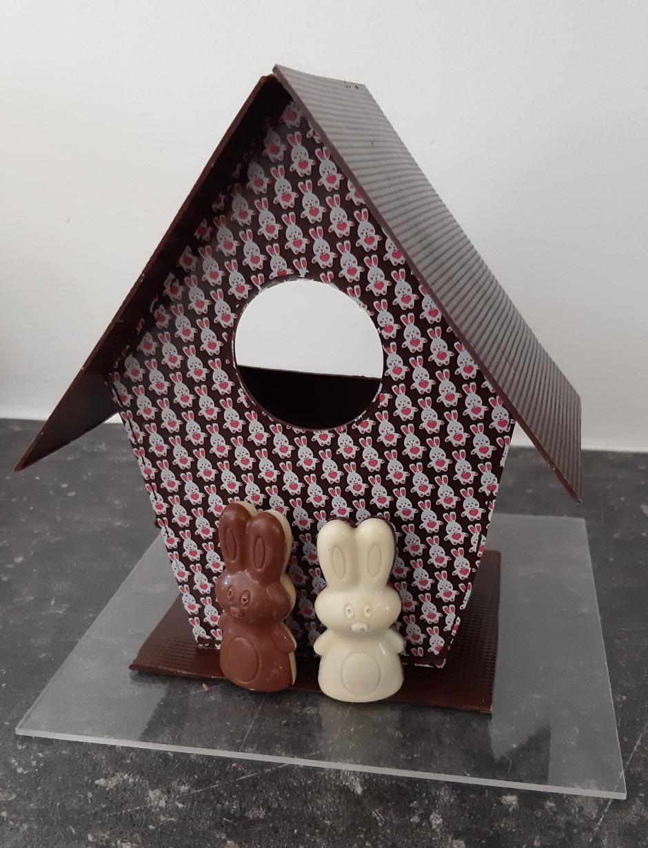 Maison en chocolat. Oeufs en sachet compris dans la maison
