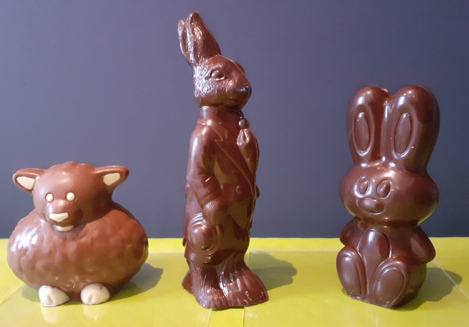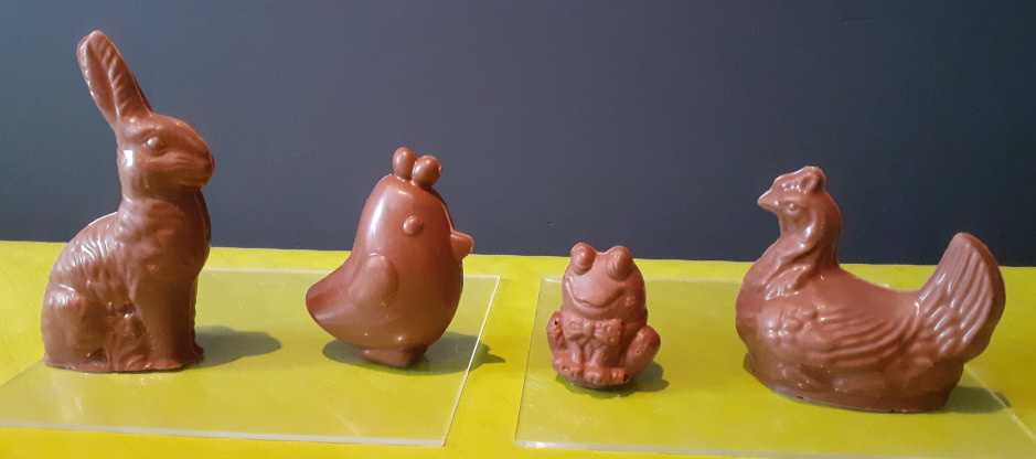 De gauche à droite 2.30 € le lapin, 1.90€ la poulette, 1€ la grenouille et 2.30 € la poule