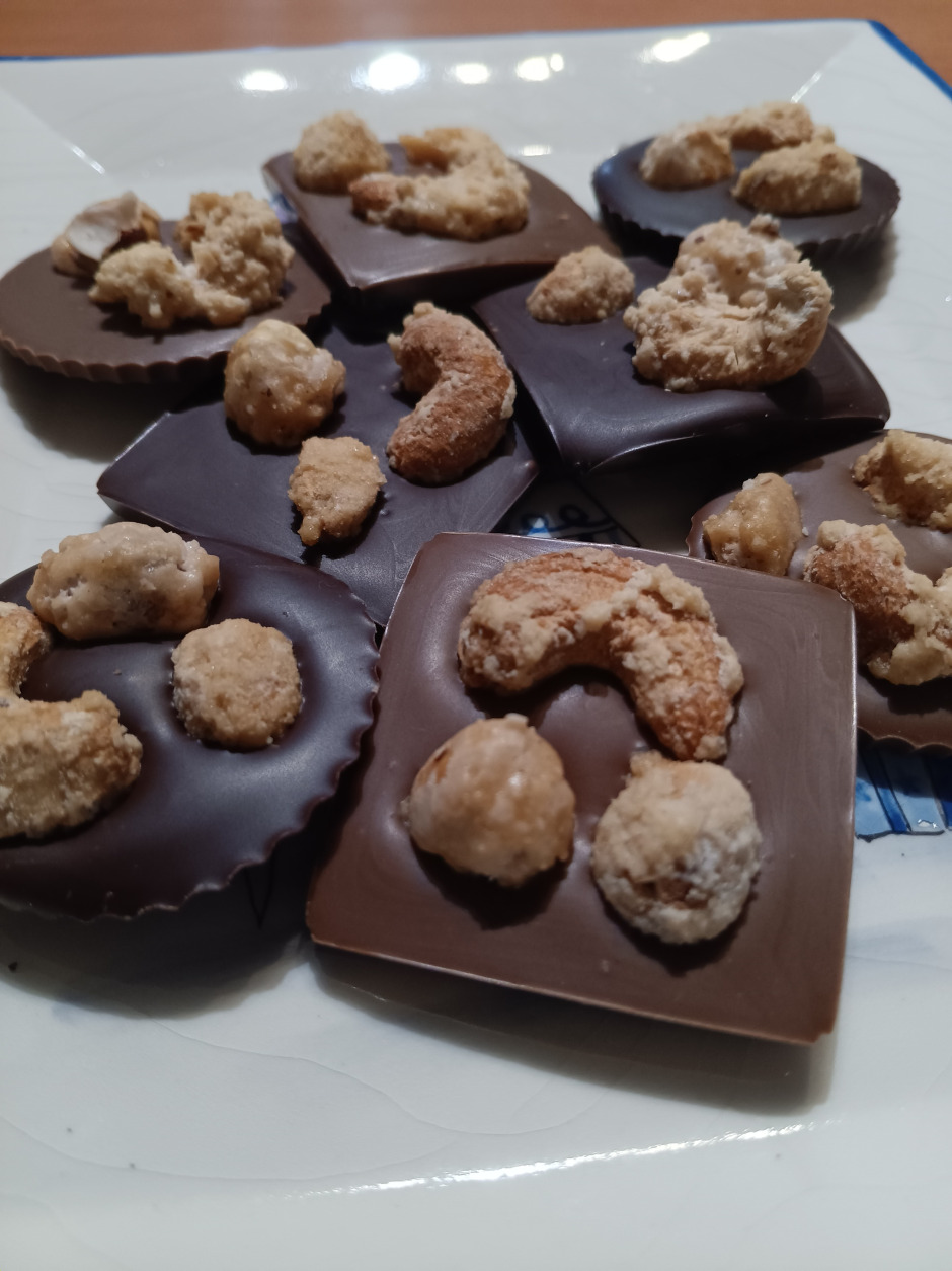 Mini-plaque de chocolat avec fruits secs (cacahuète, noix de cajou et noisette) caramélisés.