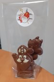 Panier en chocolat noir ou lait avec un petit Saint-Nicolas (couleur au choix) et des pralines et caraques. 230g de chocolat. Prix 10.60€