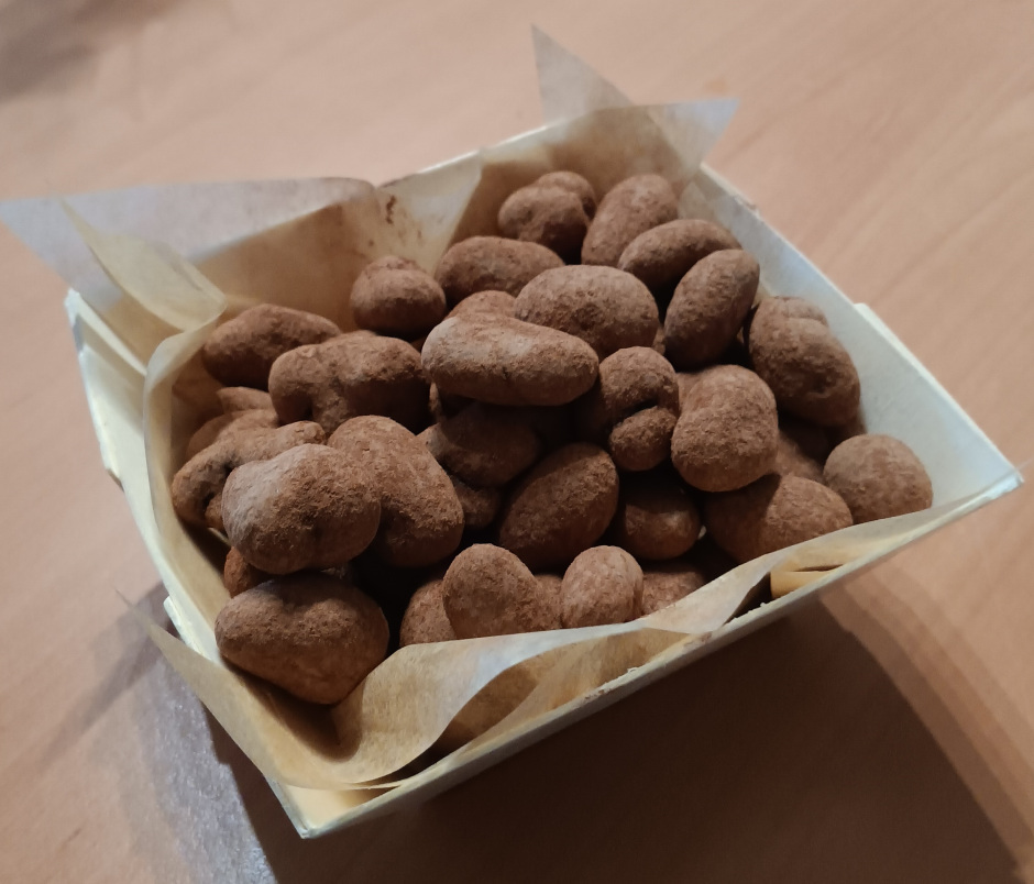 Amandes ou noix de cajou caramélisées enrobées de chocolat noir et poudre de cacao.